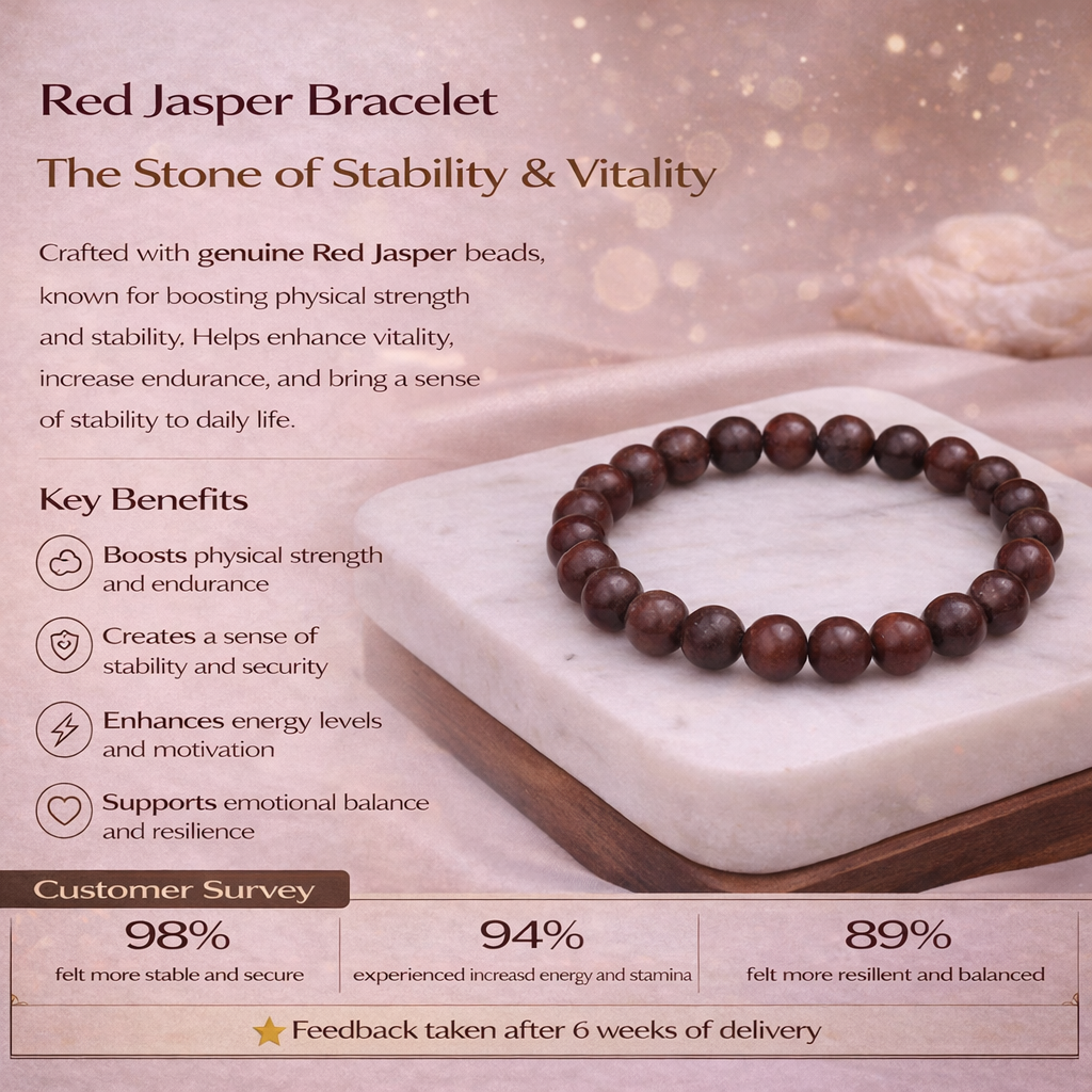 Red Jasper is a natural gemstone known for its deep red color and grounding energy. Often referred to as the “Stone of Strength,” it is believed to support courage, determination, and stability in challenging situations. The Red Jasper Bracelet helps enhance motivation, improve focus, and maintain emotional balance while protecting against negative influences.